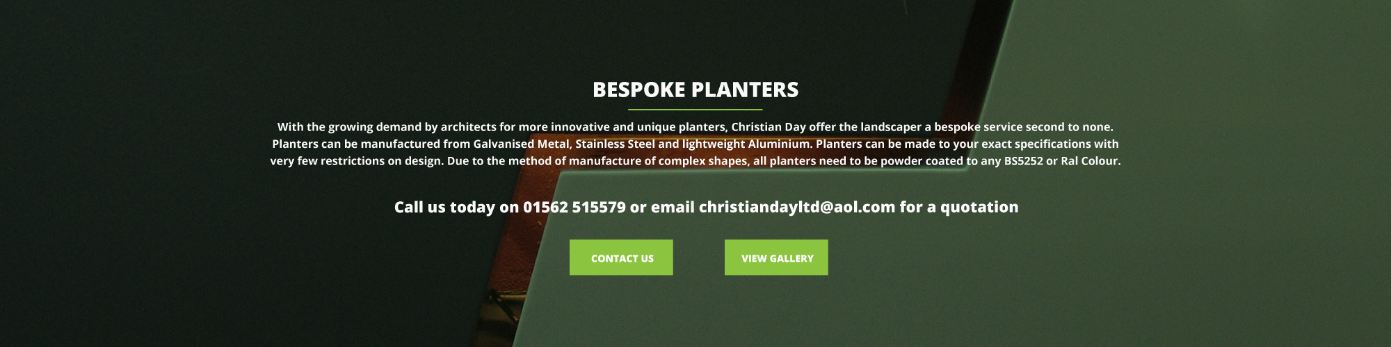 Christian Day has over 30 years’ experience in producing plant containers that are the industry’s benchmark for quality. We have a number of high profile clients in the food and catering industry, as well as in the public sector. Our comprehensive range of planters are available in different materials, including: