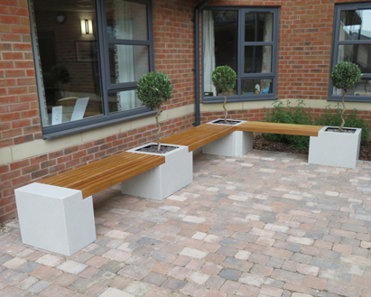 Seating has been developed to complement the planter range using Iroko as the slats for longevity and stainless steel fixing.